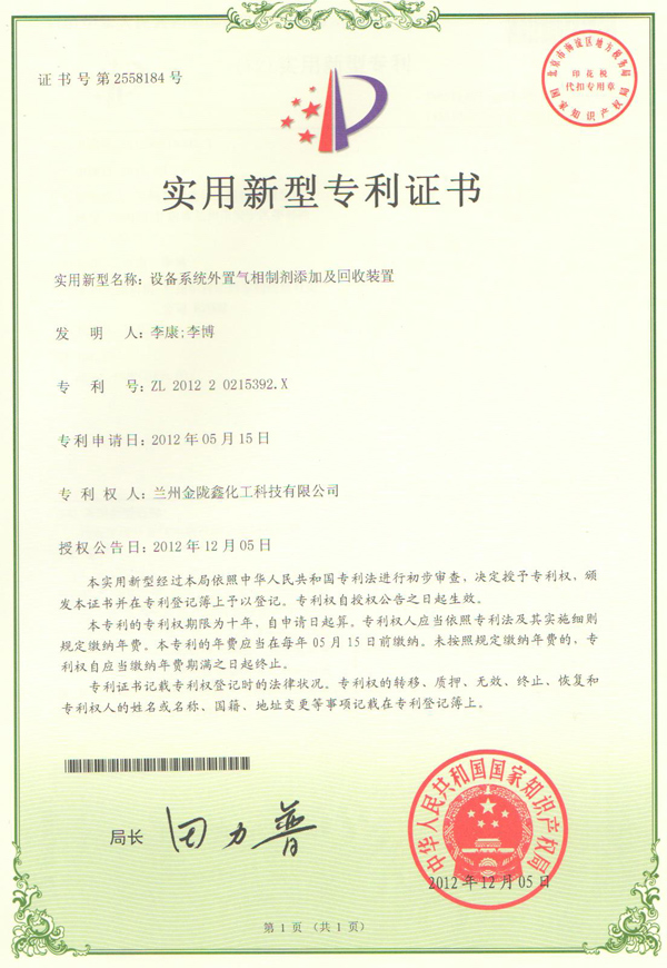 停備用設備氣相防腐劑專利證書